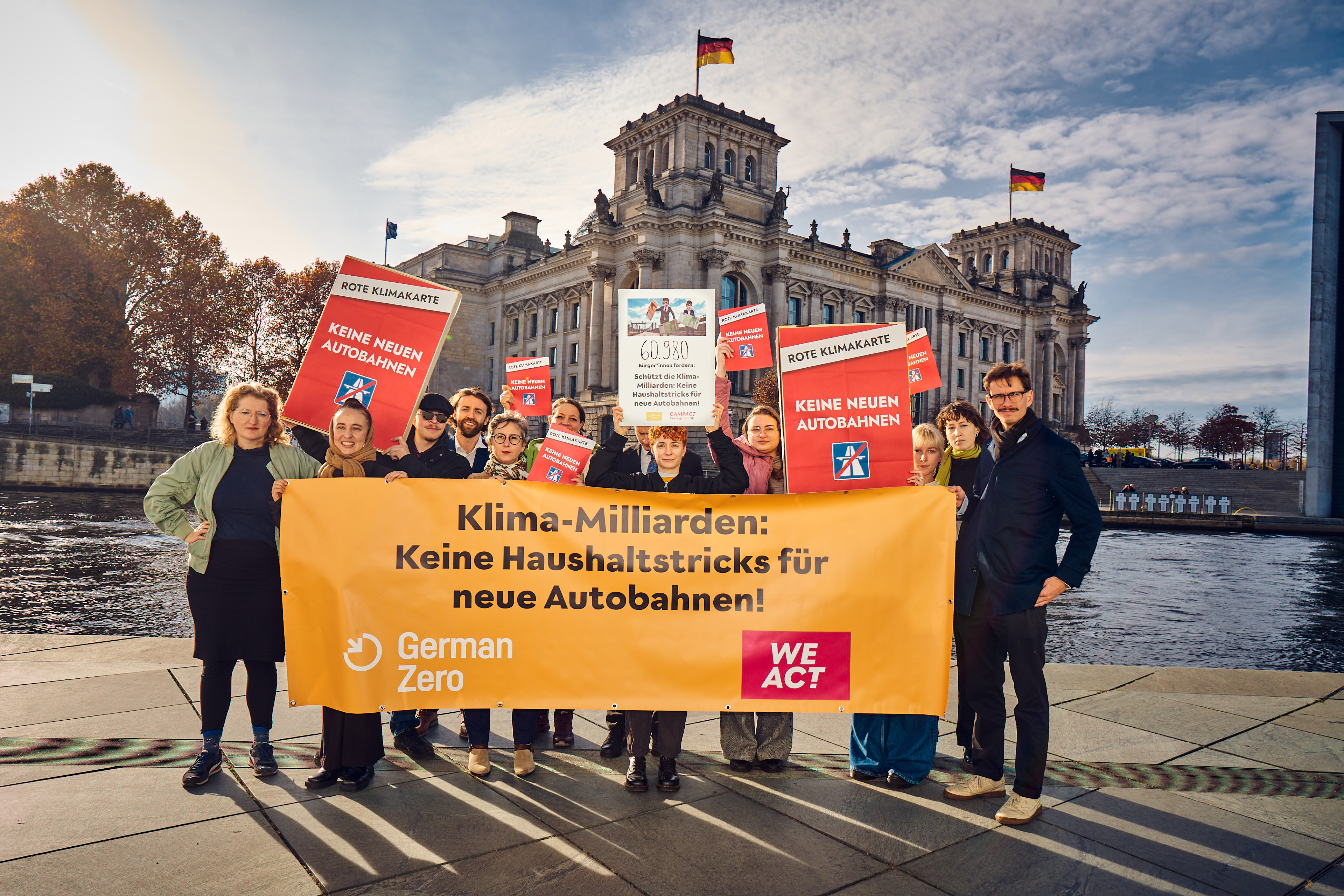 Im Vorfeld der morgen stattfindenden Bereinigungssitzung zum Bundeshaushalt 2026 hat GermanZero heute eine Petition mit über 60.000 Unterschriften an Mitglieder des Haushaltsausschusses übergeben. Mit der Petition “Schützt die Klima-Milliarden: Keine Haushaltstricks für neue Autobahnen!" appellieren sie gemeinsam dafür, sich im Rahmen der Haushaltsverhandlungen an klimapolitische Zusagen zur Verwendung des Sondervermögens zu halten. Trotz der hohen Zahl an Unterschriften von Bürger:innen, nahm niemand aus der schwarz-roten Koalition die Petition entgegen.